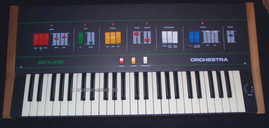 A string and brass synthesizer like the Crumar Performer or ARP Quartet , but with a big difference the Skyline Orchestra has a good phaser and that makes the sound decent